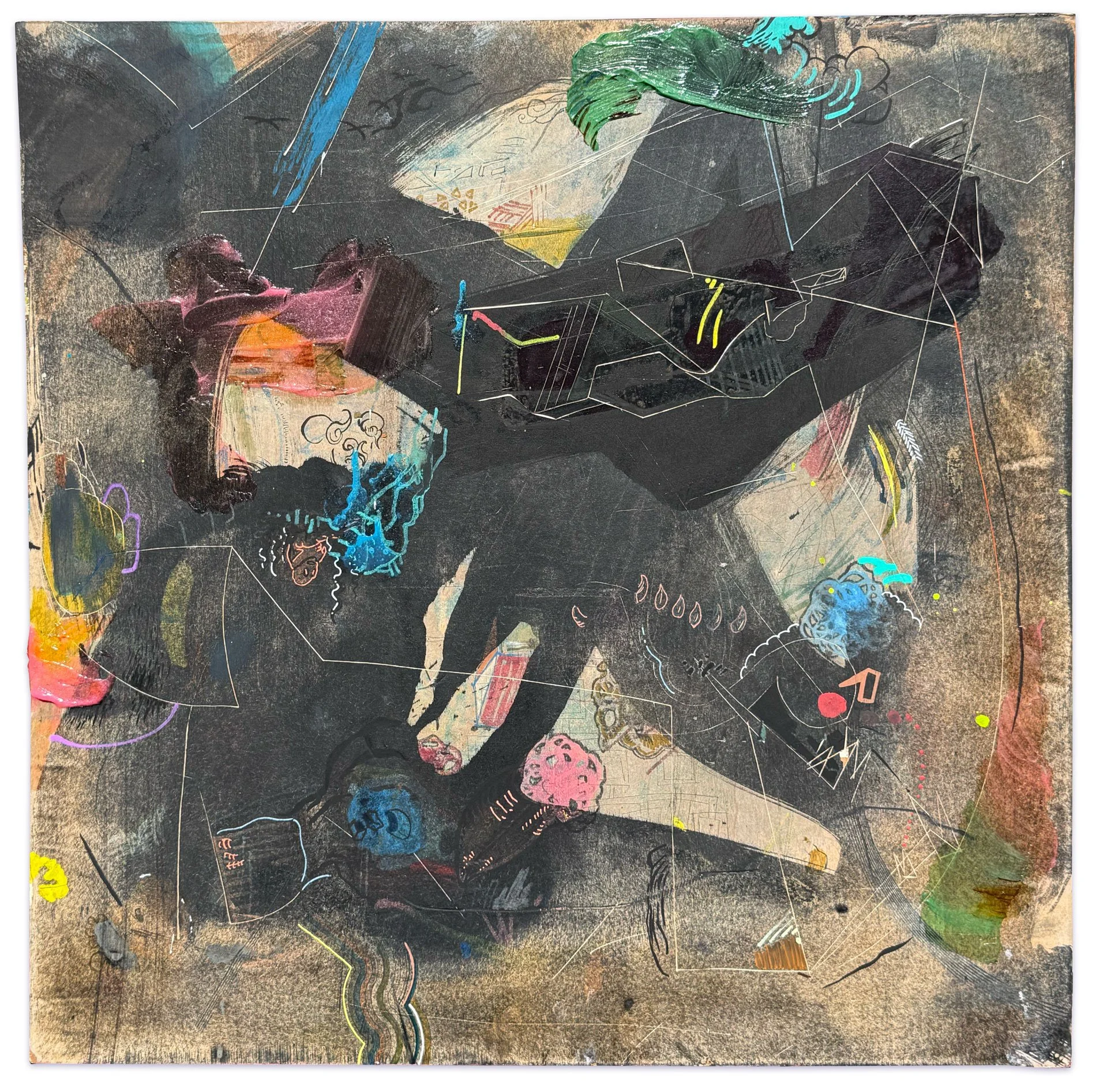 Abstract artwork with a dark background featuring colorful geometric shapes, lines, and patterns resembling celestial or cosmic elements. View fullsize
