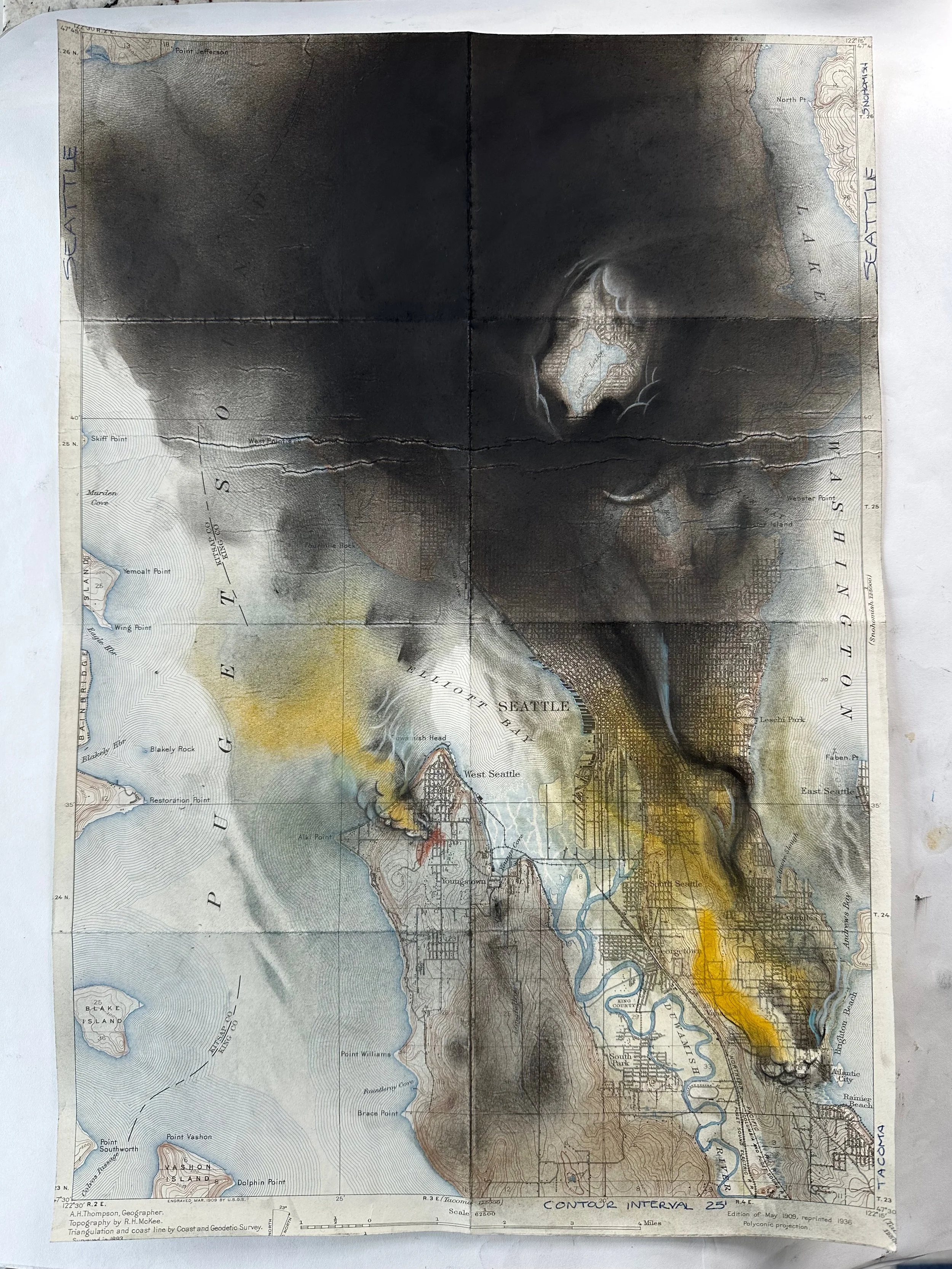 A topographical map of Seattle, Washington, with shaded contour lines, water bodies, and street layouts, overlaid with smudges and black smoke.